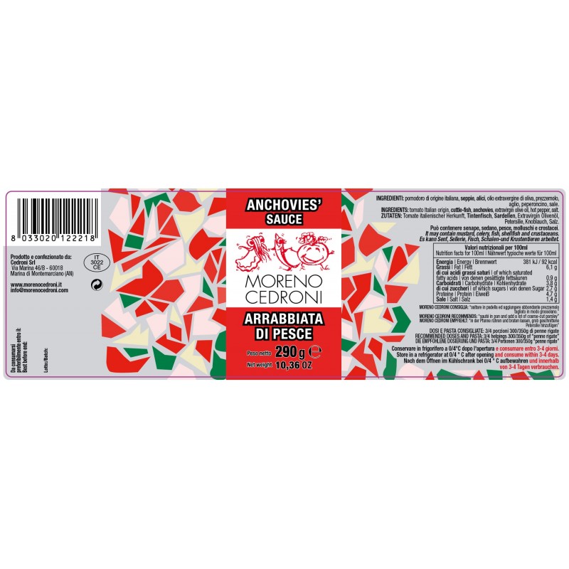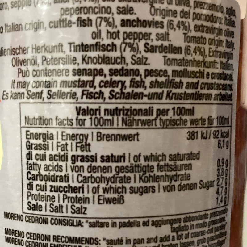 Ingredienti: pomodoro di origine italiana, seppie, alici, olio extravergine di oliva, prezzemolo, aglio, peperoncino, sale.