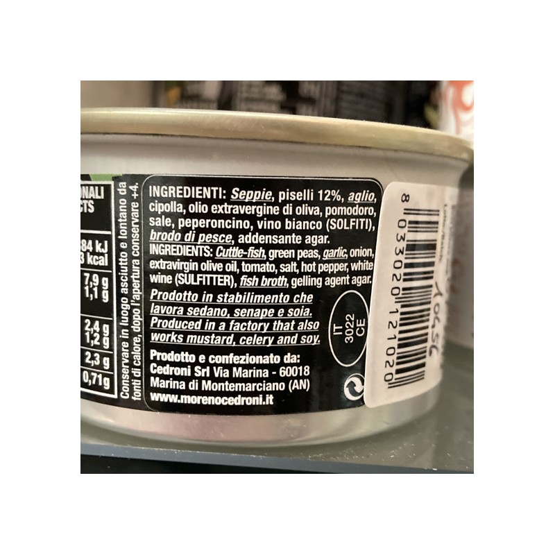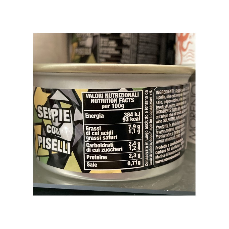 Ingredienti: seppie, piselli 12%, aglio, cipolla, olio extravergine di oliva, pomodoro, sale, peperoncino, vino bianco (solfiti), brodo di pesce, addensante agar.